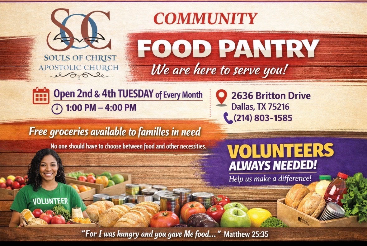 The Outreach Mission of Souls of Christ Apostolic Church is to fulfill the Great Commission by actively sharing the Gospel of Jesus Christ, demonstrating His love through practical service, and meeting both the spiritual and physical needs of our community while equipping believers to serve with purpose.